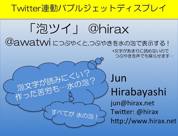 今週末、11月3日(Sun)と4日(Mon)、東京お台場の科学未来館で開催されるMaker Faire Tokyo 2013に「Twitter連動バブルジェットディスプレイ」を出展します(科学未来館一階,オリエンテーションルーム N-12ブース)。