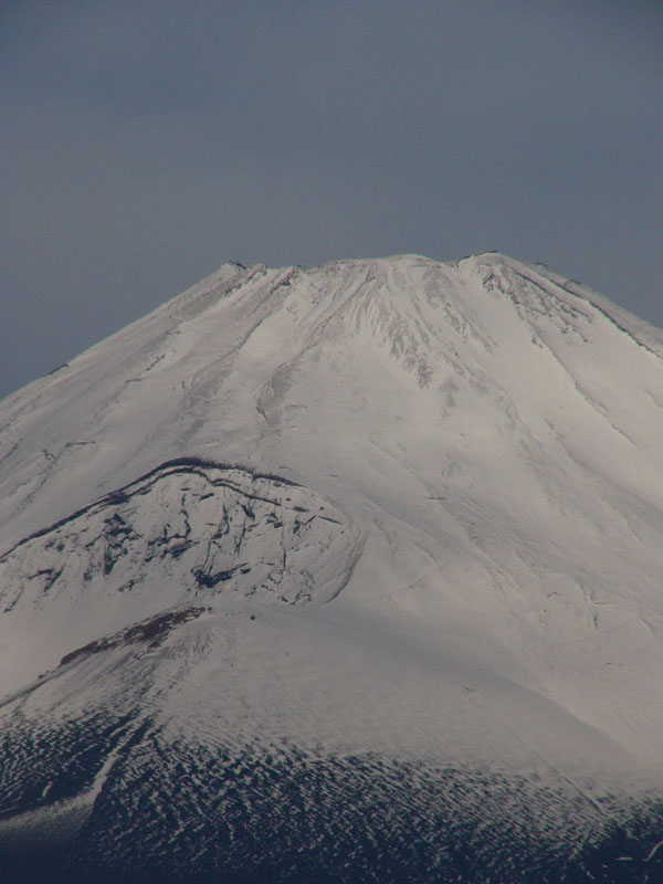 富士山の山頂を眺めてみる。さすがに12倍ズームの望遠だと富士山山頂もオペラグラスで眺めてみるよりもっと大きく見える。そして、もうすぐ夕焼け色になる間際の空を眺めると、こんな感じ。ちょっと濁って見えるのはガラス窓の向こうの景色を撮っているから。