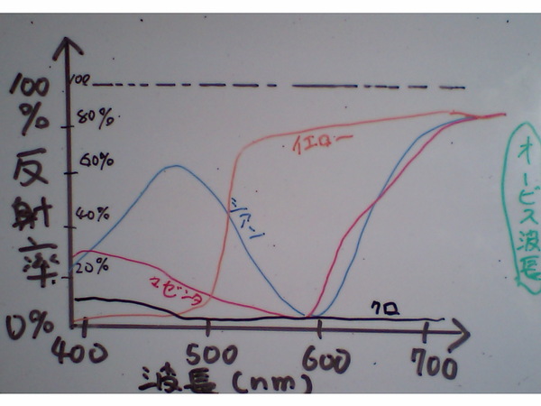 なぜかというと、レーザープリンタで使われるインク(トナー)は赤外光をほとんど吸収しないからである。カーボンブラックを使った黒いインクは赤外線を吸収するが、それ以外のマゼンタ・シアン・イエローといった色インクは赤外線をほとんどそのまま透過させてしまう。右下の図が、光の波長と透過率を示したグラフである(ディジタルハードコピー技術 P.119)。赤外線で眺めてみれば、カラーインクはほぼ透明に近いということがわかるだろう。