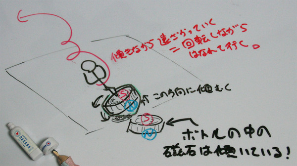 クルクル回って気持ち良くなるのはさておき、その動作の仕組みが気になってしまうのが人情でもある。ブタさん人形とボトルには磁石が入っていることはすぐにわかるのだけれども、単に磁石が(何の工夫もなく)入っているだけでは、DAKARAボトルと人形が近づいたり遠ざかったりすることはあっても、素直にクルクルと回るとは思えない。