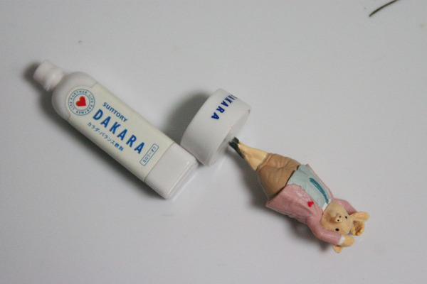 ブタさん人形とDAKARAボトルを向きを逆にしてくっつけてみると、DAKARAボトルの向きによってくっつき方が異なるのがわかる。そうなる理由は、DAKARAボトルの中の磁石が傾いて配置されている、と考えるのが一番素直である。たとえば、ブタさん人形の中にはN極を下に向け、S極を上に向けた磁石が水平に取り付けてあり、DAKARAボトルの中には、N極を下(から少しずらした方向)に向け、S極を上(から少しずらした方向)に向けた磁石が取り付けてあるというわけだ。DAKARAボトルの中の磁石を、水平面に対し角度を持たせて固定しておくのである。