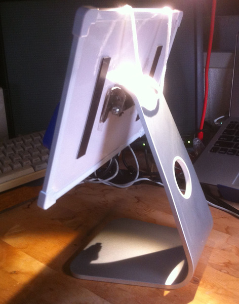 究極の文房具を作ろうと思い立ち、「カッコいいホワイトボード」を作ってみることにしました。ダイソーに行って100円のホワイトボードに100円超強力ネオジム磁石を取り付けて(ここまでは実に安っぽい)、Apple iMac を分解してスタンド部分だけを取り出して、i White Boad(アイ・ホワイト・ボード)を作ってみました。