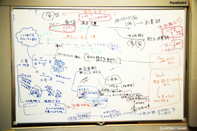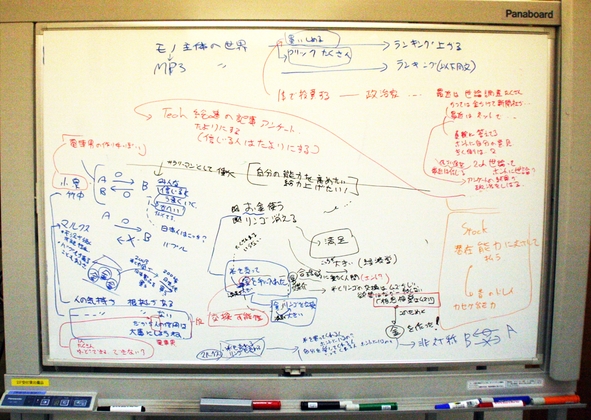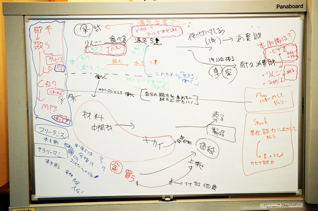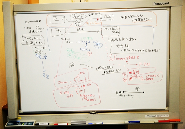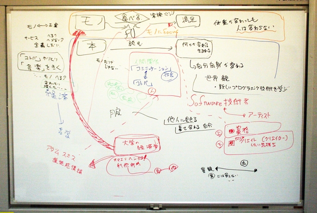 先日「経済学を勉強する」ために質問をして、質問に対する話を聞きつつホワイトボードにメモした板書です。さてさて、テープ起こししたインタビュー内容とこの板書を眺めながら、経済学の中のエンジニア? 47氏と経済学? ソーシャルブックマークと経済学? 能力給は現代の○×だ!? 「ハッカーと画家」を買うのは経済学的には何なのか?…などなど2時間分の色んな内容の中から、どの辺りの話をピックアップするかを決めてみることにしましょうか。