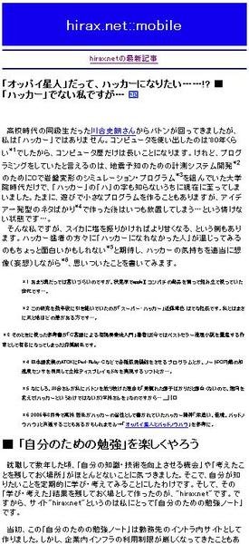 先日、携帯電話からhirax.netを眺めることができるようにしましたが(トップページ URL は http://www.hirax.net/mobile/latest で右上のQRコードがそのURLです)、関連記事表示やタグを含む記事の一覧表示といった機能を追加しました。ケータイから使う・読む分にはひとまず使いものになる・・・と良いなと思っています。