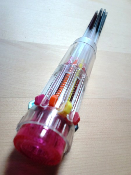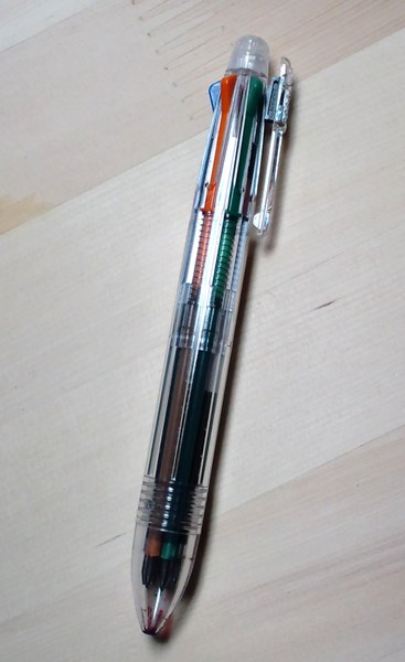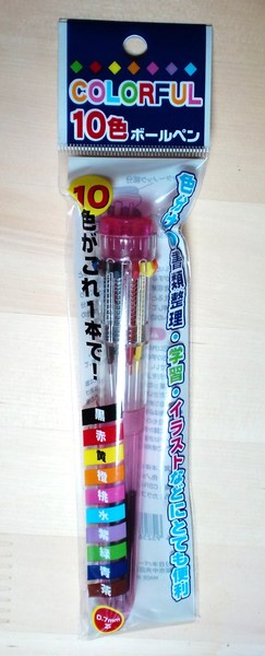 100円ショップのSeriaに行くと、「カラフル10色ボールペン(日本パール加工製)」を売っていた。「ペンの太さ」や「色の切り替えをするのにペン上部のボタンを押す必要がある」ということもあって、即時性が要求される常用ペンとして使うのは難しそうだが、100円という安さとカラフル10色というのは、とても魅力的である。そこで、試しに買って・(鞄の中に入れておく)2本目のボールペンとして使ってみることにした。