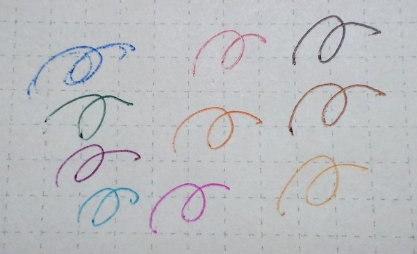 まず、ノートの上でに10色のペン先を走らせてみると、ペン先は意外に細く、(小さな文字で追記することが多い)記録メモや数式などを書くことも多い技術メモを書く目的には、意外に良さそうな感じに思える。難点としては、「カラフル」10色は、黄色の発色が悪くオレンジに近い色に見える、緑色が暗く感じられる、という辺りが挙げられそうだ。つまり、色が全体的に彩度が低い。