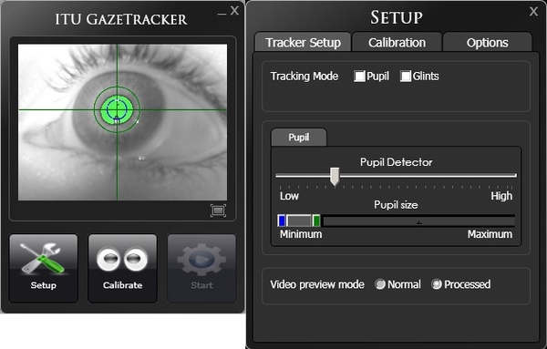 瞳を撮影しているビデオカメラから視線方向を解析するために使ったのはITU Gaze Trackerです。Windowsマシンであれば、(瞳を撮影する)USBカメラを繋ぐだけで使うことができる、という優れものです。