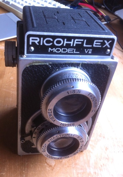 駅前スーパーの中にある雑貨屋で、"RIKEN"のロゴが刻まれた RICOHFLEX 2000円ナリを売っていました。RIKENはつまり理化学研究所から生まれた理研光学(リコー)のことで、RICOHFLEXは理研光学が数十年前に作った二眼レフカメラです。