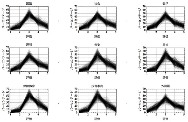 「都内公立中学校第3学年(平成25年12月31日現在)の評定状況の調査結果について」という東京都立中学の「(学校毎の)通信簿=学生評価の違い」が面白かったので、東京都立中学564校の評価結果をグラフにして眺めてみました。これは「国語・社会・数学・理科・音楽・美術…」を順番に、各学校ごとに評価5から1まで並べてみたものです。