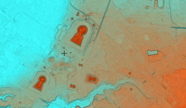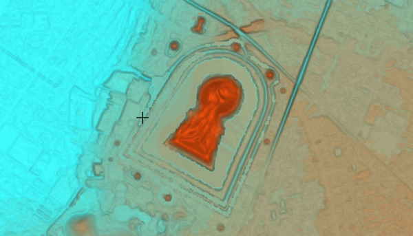 そこで、仁徳天皇陵の「外堀段差」を周囲の地形と一緒に眺めてみる。すると、古墳は、かつての海沿いの傾斜地上に作られていて、その古墳周りに外堀を作ろうとすると、(古墳中央の)水平面とその周囲に段差が作らざるをえない作りになっている。