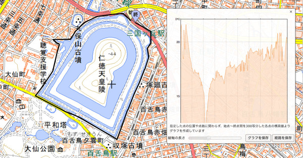 試しに、国土地理院マップで眺めると、一周をする間の最高・最低値で5mくらいの標高差があった。古墳本体を囲う堀は一体化した大きな湖のようで、重力的には等ポテンシャル面を成しているけれど、外堀は同じ標高でない作りになっている。