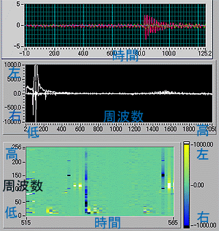 また、真ん中の「周波数(横軸)vs左右での音圧の差(縦軸)」では横軸100(任意単位)程度の高さの辺りで左チャンネルに位置する音が発生しているのがわかる。