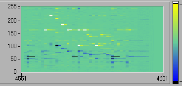 また、一番下の「時間(横軸)vs周波数(縦軸)vs左右での音圧の差(色)」では時間的に一番最後(横軸で右側)の方の横軸560、縦軸100位の位置に白い(すなわち左チャンネルに定位する)音が発生しているのがわかると思う。