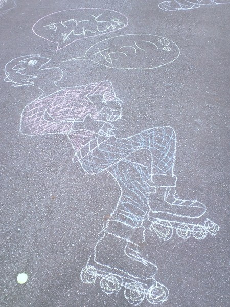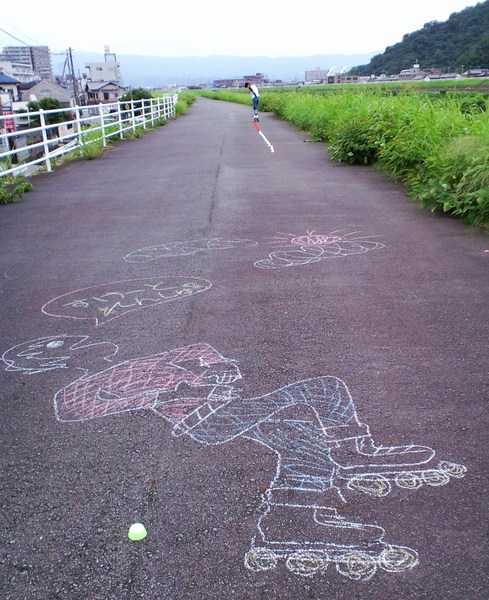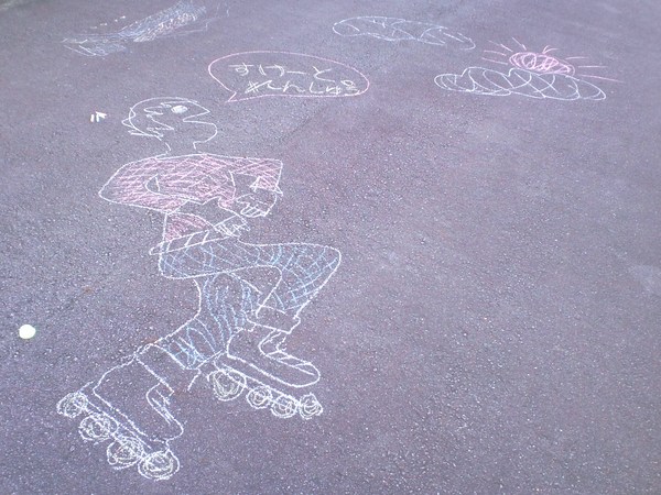時折、ふと気が向いて、道の上に落書きをしてみたりします。チョークでコキュコキュと絵を描いていると、不思議に楽しく熱中することができます。ただひとつの難点は、書いた絵を消す・直すことが難しい、ということです。チョークで書いたものを消すための「消しゴム・スプレー」みたいな素敵なグッズがあるといいな・作ってみたいな、ということが最近感じる願いのひとつです。
