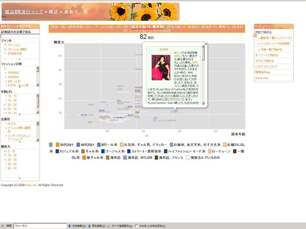 さまざまな軸で雑誌を眺めたり、言葉を眺めたり、あるいはそこに登場する人たちを眺め直してみることで、流行りや流行らないことの全体像を見てみたい、あるいはその全体の中に各部分がどう位置しているかを眺めてみたい、と思いました。そこで、そんなことができるツールを作ってみたのです。