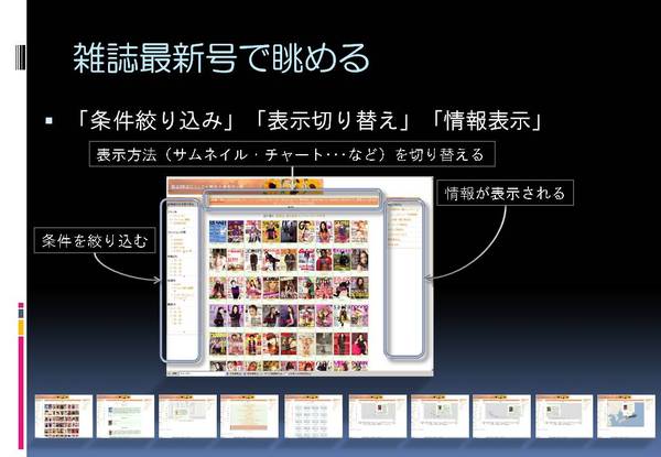 右に貼り付けた説明スライドのように、「雑誌DE流行マップ」の狙いは雑誌や流行りというものを色々な見方で眺めたいということです。