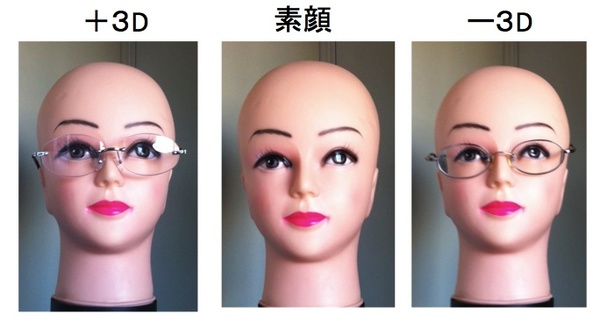 近視用の-3D(ディオプシー)メガネ、遠視・老眼用の+3Dメガネをマネキンヘッドに掛け、素顔との違いを比べてみたのが下の図です。(視力が0.3程度以下の人が掛けている-3Dのメガネでは目が結構小さく見えてしまうし、結構な遠視・老眼の人がかける+3Dのメガネの場合には、瞳がずいぶんと大きく見える!と実感できるのではないでしょうか。