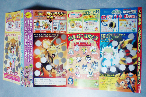 小学一年生 四月号の冒頭は、「人気もの 入学おいわい! 4大ぎんはがし」というプレゼントコーナーだった。きらりん☆レボリューション / 恐竜キング / たまごっち / ポケモン という4大人気者を題材にした、銀スクラッチを使ったプレゼント特集である。イラストの中に、12~15個程度「銀スクラッチ」で隠された部分があって、そのうちの8割くらい(たとえば、10個程度の部分)の銀スクラッチをセロハンテープで剥し、「あたり」が多く出ればプレゼントに応募することができるのだ。