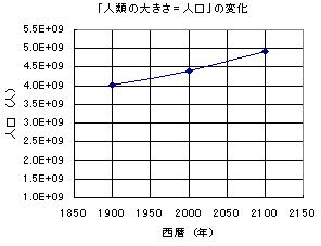 では、単に「信号伝達速度の変化」と「大きさ(人口)の変化」を並べて「処理速度」の変化について考えてみただけだった。今回は寺田寅彦が考えたのと同じく、「信号伝達速度」と「大きさ(人口)」から「寿命」が決まると考えることにより、「人類」の「寿命」の変化について考えてみることにしたいと思う まずは、前回使った「人類の大きさ=人口」の変化が次のグラフである。ただし、この人口は全然正確ではないし、むしろかなり不正確なものであることは先に断っておく。ここでは、細かな値を使うのが目的ではないので別に構わないだろう。