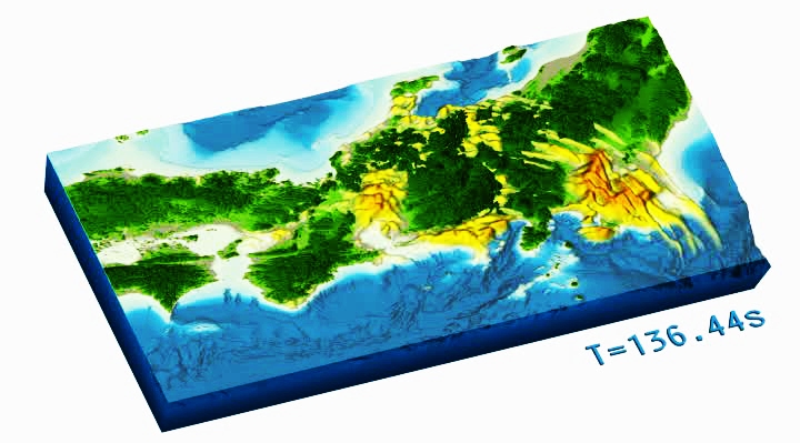 なんだかとてもブルーになりつつ、地球シミュレータで計算された東南海-東海地震の揺れの様子を眺め直すと、さらにブルーになりました…。ちなみに、沼津は伊豆半島の西(左)の付け根辺りです。これは、地震波が最も東側に偏る(私からすれば)最悪に近いケースであるようですが、やはりブルーです。