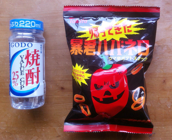というわけで、100円ショップのローソン100で、帰ってきた「(2003年誕生当時のウマ辛さ!)暴君ハバネロ」とアルコール25パーセントの焼酎160円ナリを買い、キンキンに冷やした水とアルコール度25パーセントの焼酎のどちらが、暴君ハバネロの激辛痛みを和らげるかを調べて見ました。