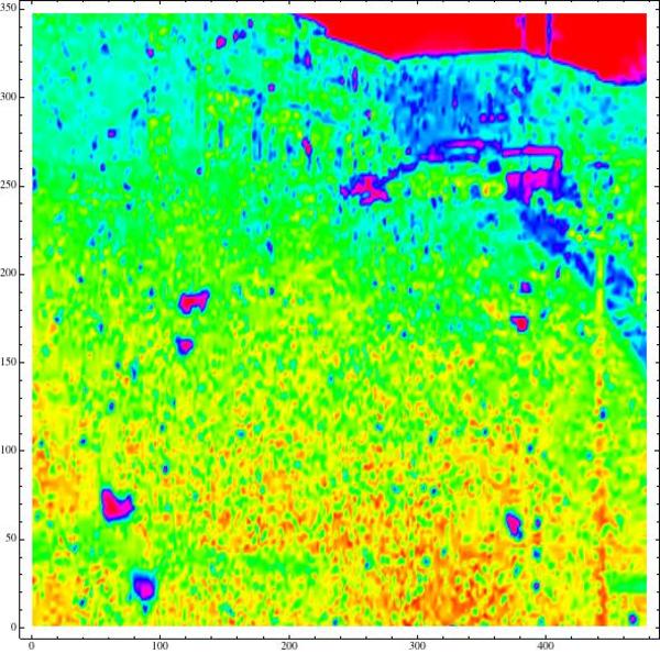 この動画を見てわかることのひとつは、雪が写っている部分は「真っ白」に飽和している、ということです。つまり、空気中を降り・動く雪が写っている部分は決して「うっすらと雪が半透明に写っている」わけではなく、雪が移動している部分が「(サチって=飽和して非線形極まりない状態になっていて)すべて真っ白」に見えているということです(右下の画像は、輝度が飽和していることがわかりやすいように輝度を色相で表現したものです)。