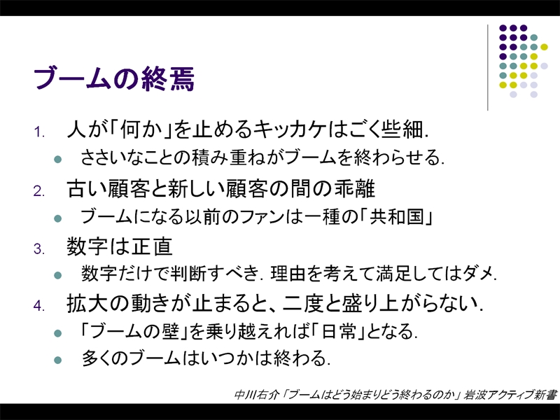 中川右介氏が中古カメラのブームを振り返りながら書いた「ブームはどう始まり どう終わるのか」を読んだので、(私が興味深く感じた)流れを三枚のスライド資料としてメモしてみる。何か流行っているものがある時には、このスライドを眺めて「何が何に対応するか」を考えてみることにでもしようか。