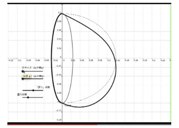 この動画は、オッパイの表面(境界)の各部分にかかる力を元に、張力を計算し、張力を曲率に(テキトーに)換算を行った上で、曲率=2階微分値を2階積分した結果をGeo Gebra でインタラクティブに図示した図を(大雑把に言えば)、パラメータを適当に動かすことでアニメーションにする…という具合で作られています。