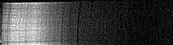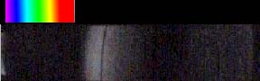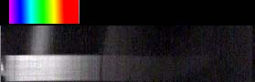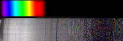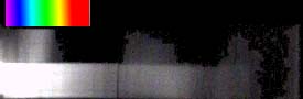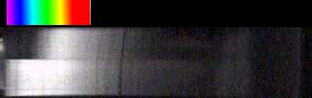 まずは、その分校計測出力例を示してみたい。下の写真は「CCDカメラで計測したスペクトルに、可視光の色対応を示すカラーバーを上に示したもの」である。これは前回と同じく、太陽光のスペクトルだ。水平軸が波長を示している。左が波長が短い領域であり、右が波長が長い領域である。可視光領域は左の1/3くらいの領域である。
