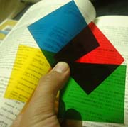 だから、赤色フィルタと緑色フィルタを重ねると、全然透けないわけだ。透過可能な波長領域がないワケである。こういうのを見ると、暗記用の赤色ペンと緑色下敷きの組み合わせを思い出してしまう。