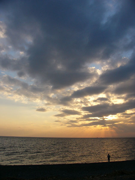 それにしても、何百回と眺めても、やはり海の近くで眺める青い空はとても綺麗だ。右の写真のような、もうすぐ日暮れという時の深い青とゴールドの空も、日が落ちる瞬間の赤い風景も、日が沈んだ後の藍色の空もどれも本当に綺麗だ。気分はもう、老後の散歩をしている夕暮れ、なのである。