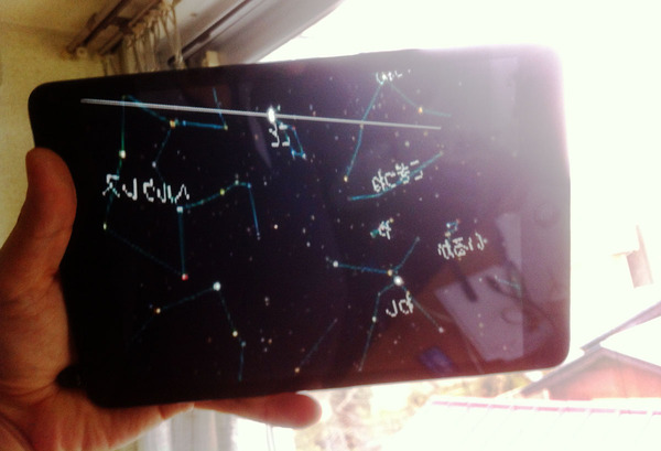 (手に持った) iPad mini 上に、見る方向に応じた映像を表示するようにしたくて、まずは、360°の全周囲に拡がる星や星座を表示させてみました(鏡像になってしまっているのはご愛敬…ということで)。