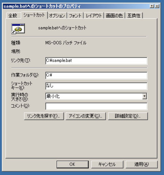 バッチファイルを直接呼び出すのではなく、ショートカットを作り呼ぶようにするのは、コマンドプロンプトを表示させないようにするためです。右に示すダイアログ画面のように、バッチファイルの「ショートカットの実行時のプロパティ」を「最小化」にしておけば、QuickTimePlayer.exeを立ち上げるコマンドプロンプト(のような余計なもの)を聴衆に見せずにすみます。