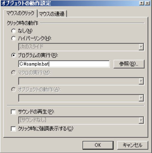 「動画のエンコーダ」や「複数の動画の再生を簡単にしたい」という場合に便利なのが、次のようなMS-DOSのバッチファイルを書き、さらにそのバッチファイルのショートカットを作ることで、PowerPointのオブジェクト(たとえば画像など)をクリックし、バッチファイル(へのショートカット)を呼び出す、というテクニックです。