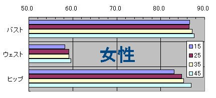 女性の場合、バスト・ウェストに関しては「年をとるにしたがって、理想の数値が微増する」だけであるのに対して、「理想のヒップの数値はとても大きくなっています。色々な想像をしてみると、例えば、「(下半身から太る現実を前にして)理想が現実に引き寄せられている」なんていう原因が想像できます。しかも、そんな「現実と理想のすり合わせ」を、同世代男性側の「豊かなヒップが理想だと思うようになる傾向」がさらに支えていたりするのだろうか?なんていう妄想も浮かんできます。