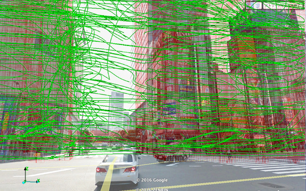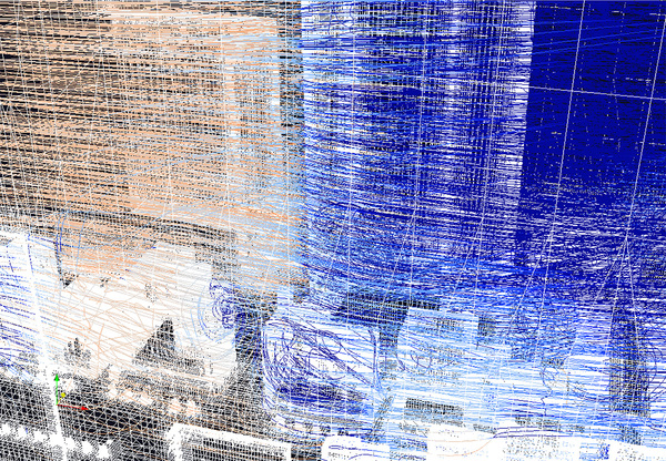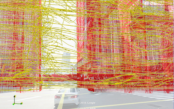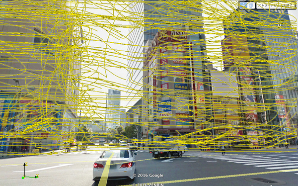 北風が吹く初春には、秋葉原愛三ビル前交差点辺りがスカートがめくれやすい危険地帯です!? で行った秋葉原の街中に吹く風の流れを計算した結果を、同じ視点から・同じ構図で見たGoogle Earth(Google Map)の実写画像に重ね合わせてみました。実写風景に重ね合わせながら、コンピュータの中で計算された風の動きを眺めてみると、風の気持ちや心の動き…ならぬ流体の動きが一目瞭然に見えてきて、面白いものです。