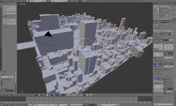 単刀直入に回答例を書くと、この季節…まだ北風が吹く初春には秋葉原愛三ビル前交差点辺りが「スカート」がめくれやすいです。たとえば、株式会社ゼンリンが3Dゲーム・エンジンUNITY用に提供している「秋葉原3Dマップ」を3D形状でーたとして出力した上で、さらに流体計算ソルバOpenFOAMに読み込んで(右図はOpenFOAMに読み込む前に3DソフトBlenderで編集している作業画面です)、秋葉原に吹き付ける北風が「通りを歩く人たち」にどんな力を及ぼすかを計算してみたのが次の図です。