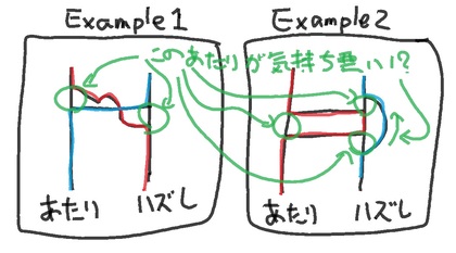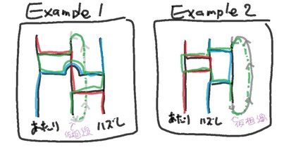 この「時空間を歪ませるようなスペシャル線」は一体どう扱う・どう考えれば良いのでしょうか?そんなに考え込むことでもないのかもしれませんが、あみだくじというものを考えるとき、「通らない線がある」「横線に対して、(両方向に進む経路があって欲しいのに)片方向に進む経路しかない」「線を追いかけていくと、下から上に遡らなければいけない部分がある」というのは、あまりに「おさまりが悪いこと」であるように思われます。